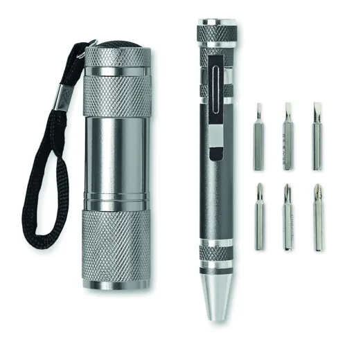 Szerszámkészlet dobozban. 9 LED-es alumínium zseblámpa és egy többfunkciós, alumínium, toll alakú szerszám. 3 normál- és 3 Phillips csavarhúzó fej. 3 db AAA elemmel működik, elem nélkül szállítjuk.