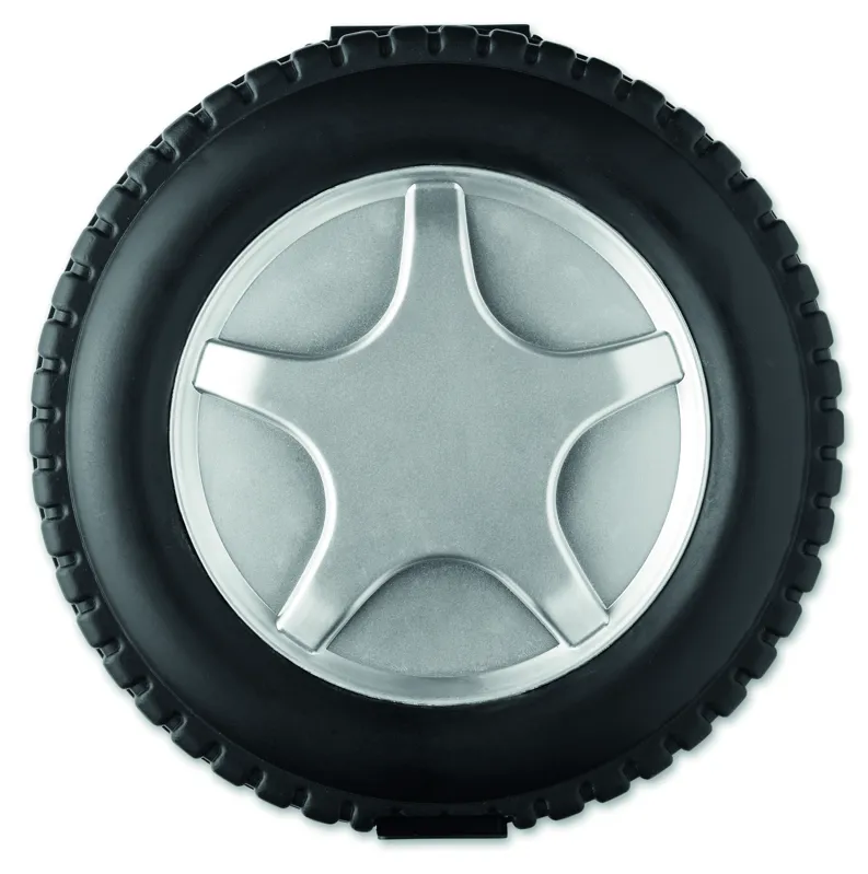 25 darabos szerszámkészlet gumiabroncs alakú dobozban. Tartalma: 1 csavarhúzó nyél, 1 hosszabbító, 1 laposfogó, 5 csőkulcs, 3 imbuszkulcs, 10 bitfej (behajtóhegy), 2 precíziós csavarhúzó és 1 mérőszalag.