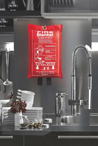 Üvegszálas tűzoltó takaró PVC tokban. Méretek: 95x100 cm.