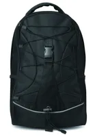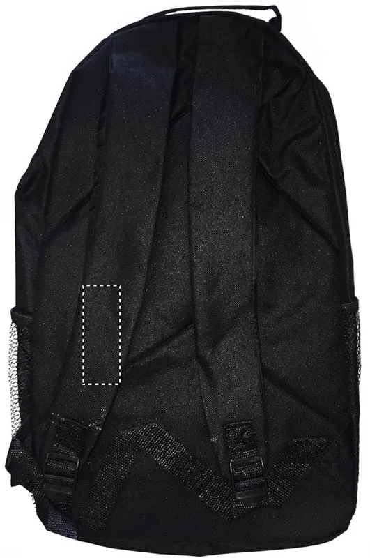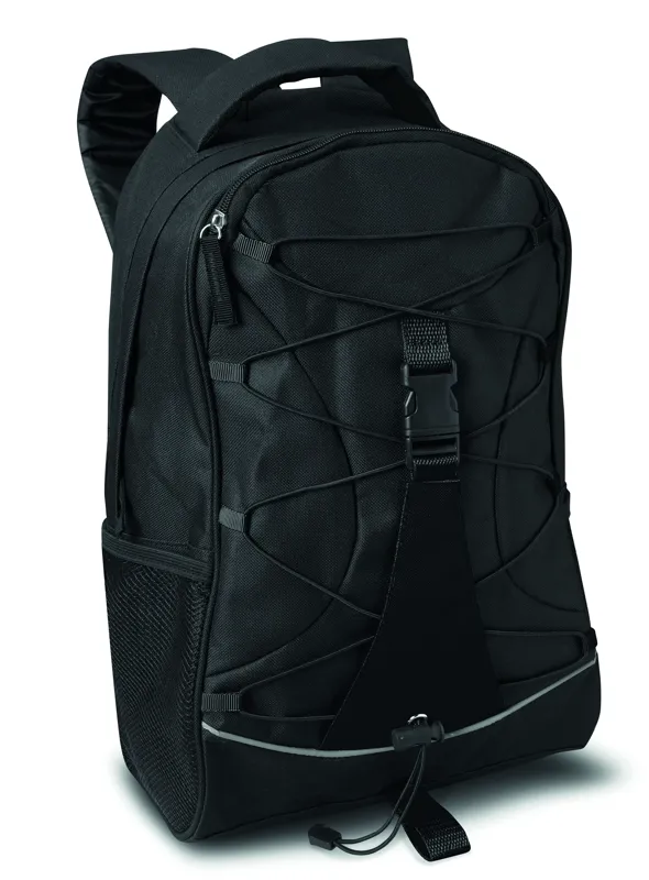 Fekete hátitáska színes betéttel és zsinórral az elején. 600D poliészter anyagból. Kétoldalt hálós zseb a palackoknak.