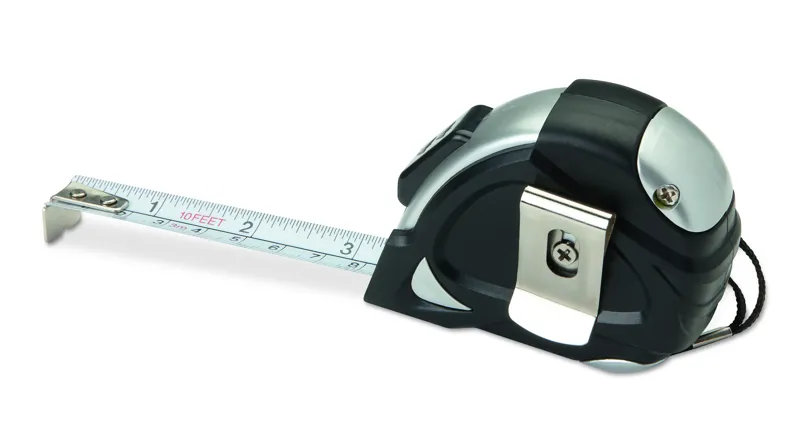 3 méteres mérőszalag ezüst és fekete házzal. ABS anyagból. Csuklópánttal és fényes, ezüstös, övre akasztható csíptetővel.
