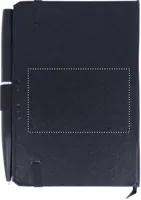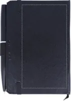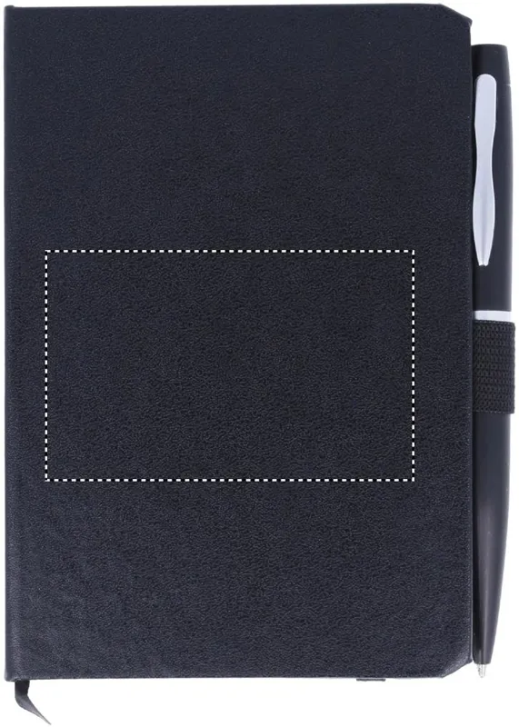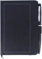 A6 jegyzetfüzet golyóstollal. PU keménytáblás borítóval. Cérnafűzött. 144 vonalas oldal (72 lap). Színben illeszkedő elasztikus zárópánt, tolltartó hurok és könyvjelző szalag. Fém nyomógombos golyóstoll, kéken író betéttel. FSC MIX CREDIT | P7.1 | FSC-C213206