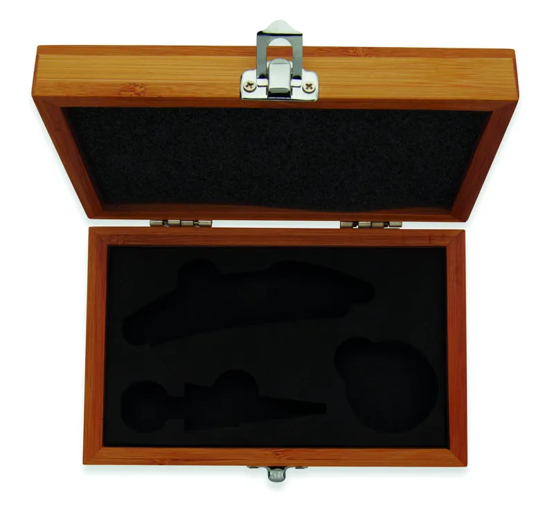 Boros készlet bambusz dobozban. Dugóhúzót, cseppfogó gyűrűt és palack visszazárót tartalmaz, rozsdamentes acélból és bambuszból. A bambusz természetes anyag, színében, mintázatában és méretében esetenként eltérő lehet.