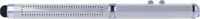 Fém lézermutató. Fehér LED, piros lézermutató fény és puha érintőhegy vég. A működéshez szükséges 3 db LR41 gombelemmel szállítjuk. Bádogdobozban.