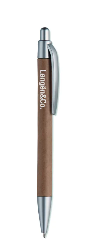 Nyomógombos golyóstoll újrahasznosított papír borítással, fényes ABS részekkel. Kéken író betéttel.