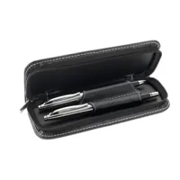 Golyóstoll és roller toll szett cipzáras PU bőr tokban, kontrasztos varrással. A golyóstoll kék, a roller feketén író betéttel.