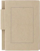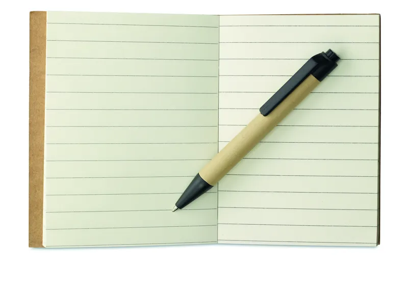Újrahasznosított papírból készült jegyzetfüzet golyóstollal. Puha papírborító tolltartóval. Cérnafűzött. 160 vonalas oldal (80 lap). Nyomógombos golyóstoll újrahasznosított kartonból és biológiailag lebomló műanyagból. Kéken író betéttel. FSC®-certified | FSC MIX, P7.1, FSC-C213206