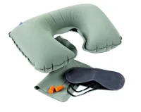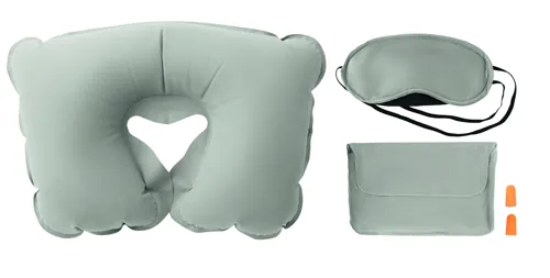 Utazószett bársony tokban. Tartalma: felfújható bársony párna, szemmaszk és füldugó.