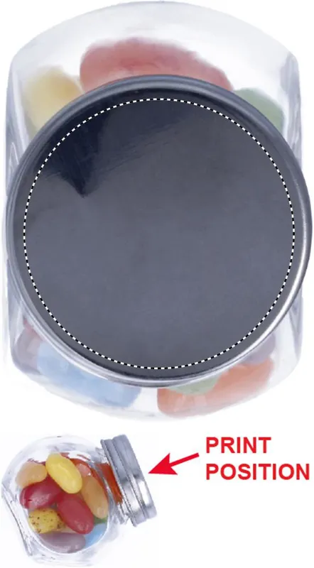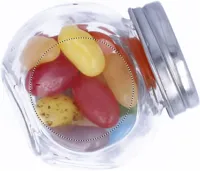 Többszínű jelly beans zselés cukorka fémfedeles üvegedényben. 40 gramm cukorka.