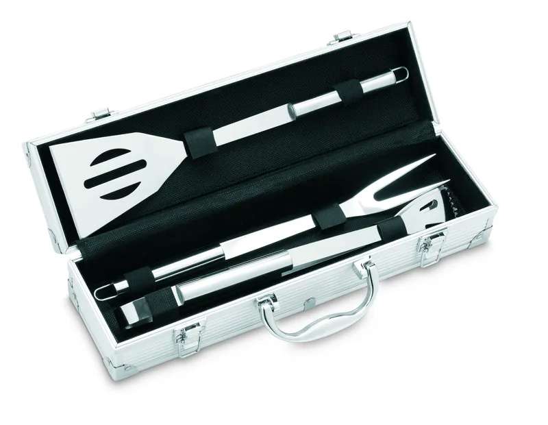 Alumínium táska 3 db rozsdamentes acél grillező eszközökkel. Kiváló emblémázási felülettel.