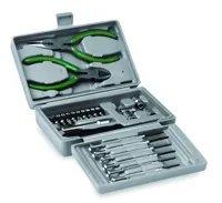 25 részes, összecsukható szerszámkészlet műanyag dobozban. Tartalma: 6 db precíziós csavarhúzó, csavarhúzó nyél, hosszabbító, 4 db csőkulcs, laposfogó, oldalcsípő fogó és 10 db bitfej (behajtóhegy).