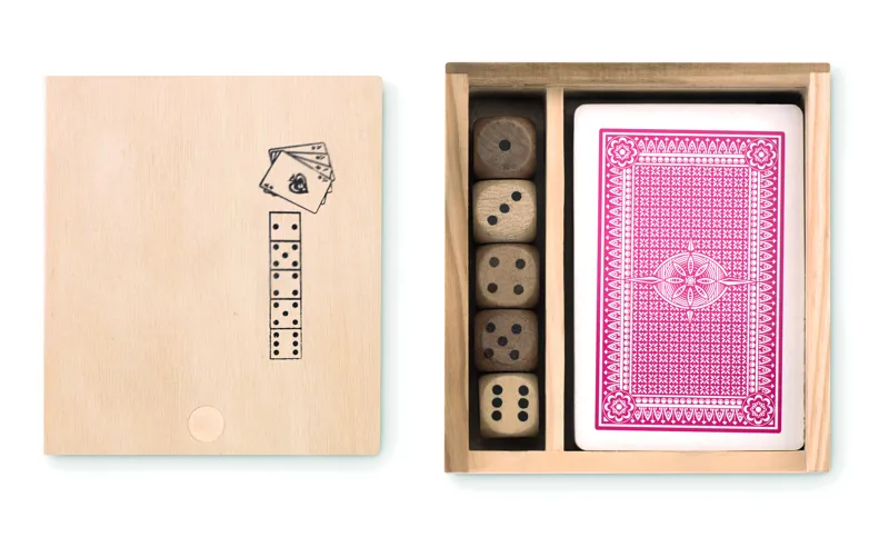 Játék szett 54 kártyával és 5 dobókockával. Fadobozban.