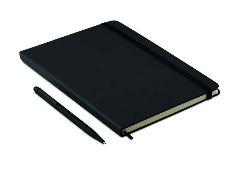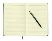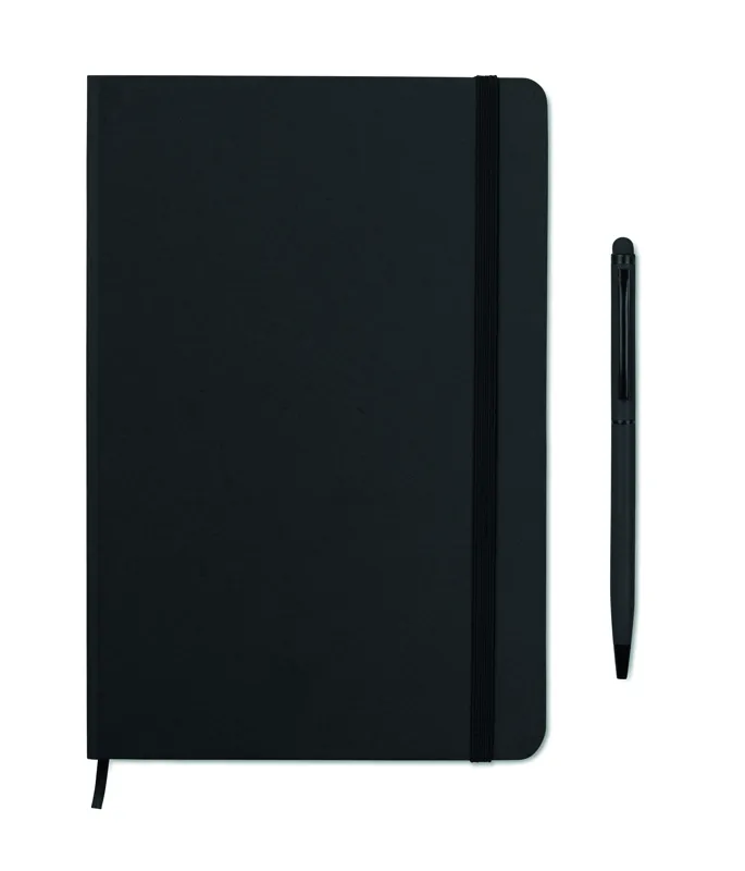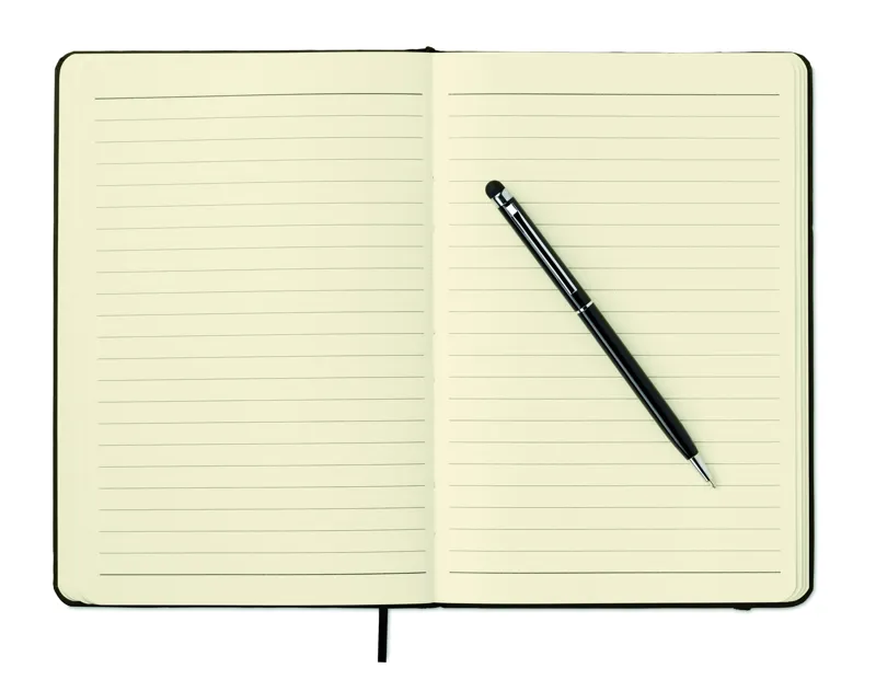A5 jegyzetfüzet érintőhegyes golyóstollal, keménytáblás borítóval. Cérnafűzött. 144 vonalas oldal (72 lap). Fekete elasztikus zárópánt és könyvjelző szalag. Színben illeszkedő érintőhegyes golyóstoll, kéken író betéttel. FSC MIX CREDIT | P7.1 | FSC-C213206
