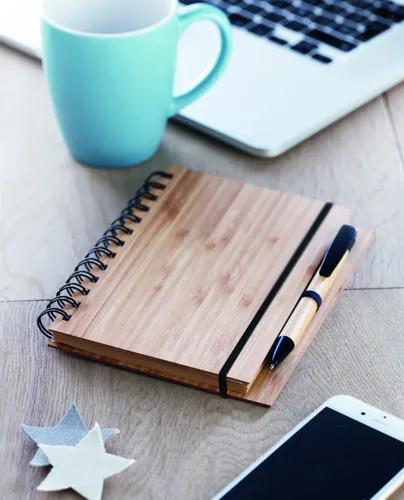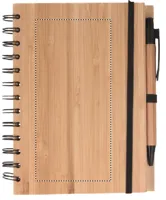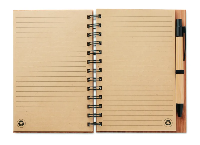 Bambusz borítójú jegyzetfüzet, hozzá illő tollal. Ikerspirálozott. 140 vonalas oldal (70 lap) újrahasznosított papírból. Hozzáillő nyomógombos golyóstoll bambusz tolltesttel és ABS szerelvényekkel. Elasztikus tolltartó hurok. A bambusz természetes anyag, a szín termékenként eltérő lehet. A bambusz természetes anyag, színében, mintázatában és méretében esetenként eltérő lehet. FSC®-certified | FSC 100%, N5.7, FSC-C213206