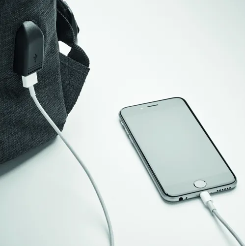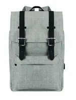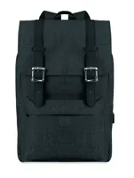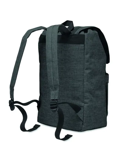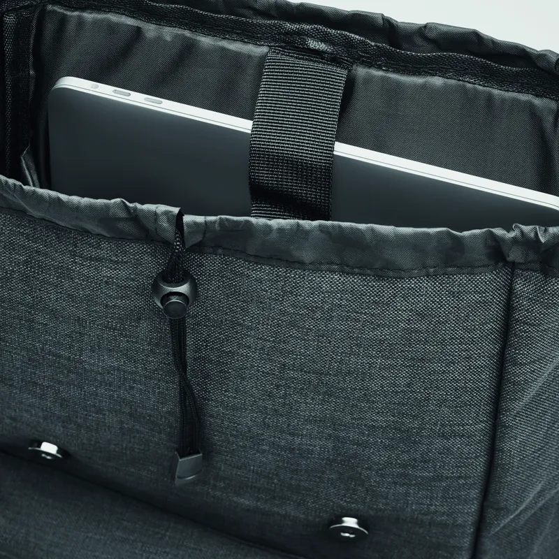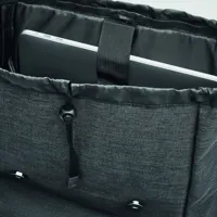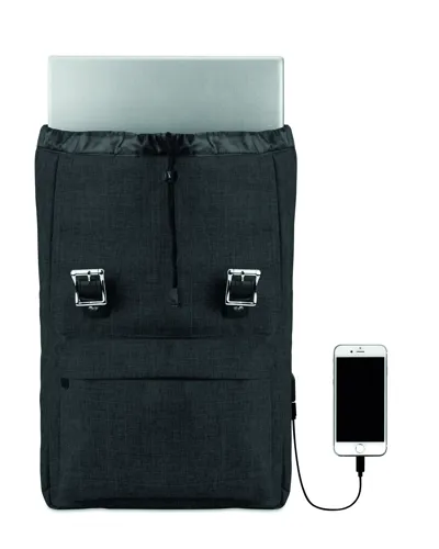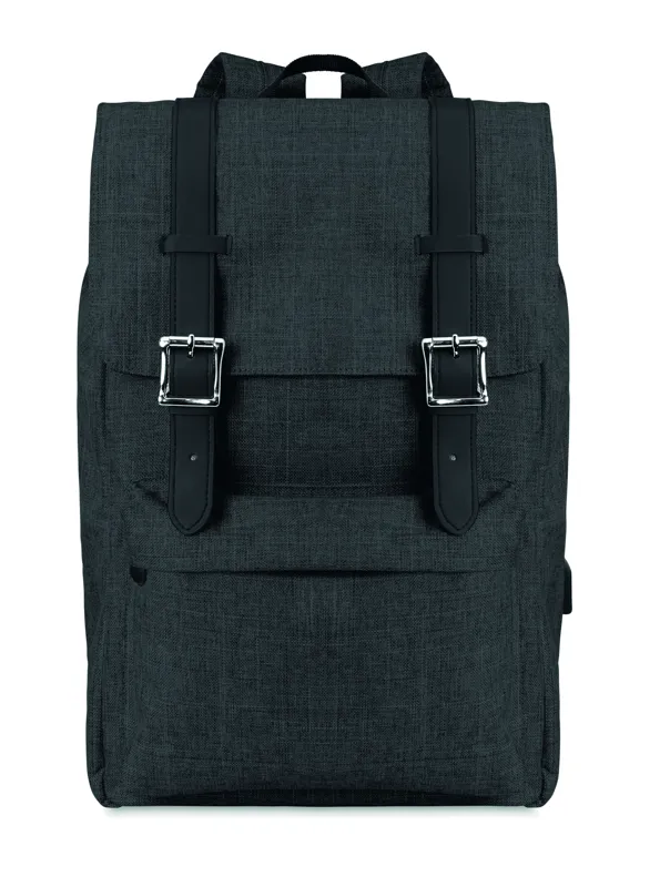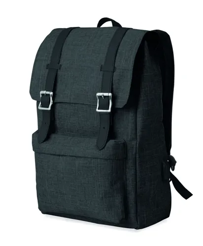 Laptoptartó hátizsák melírozott 600D poliészter anyagból, párnázott vállpántokkal. Egy fő belső rekesz 15 colos laptop számára, beépített USB töltőkábel. Mágnespatentos záródással, elől cipzáras zsebbel.