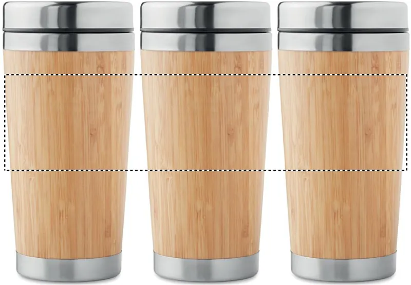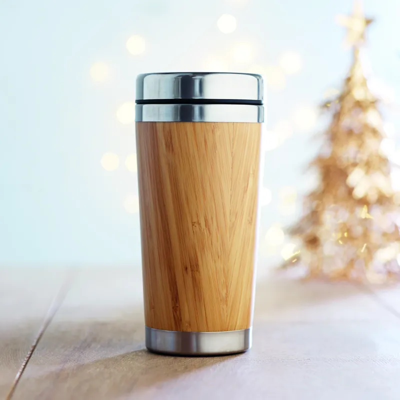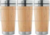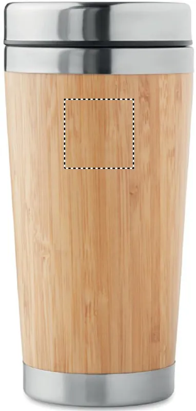 Rozsdamentes acél úti bögre PP műanyag fedéllel, bambusz borítással. 400 ml űrtartalom. A bambusz természetes anyag, színében, mintázatában és méretében esetenként eltérő lehet.
