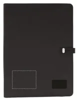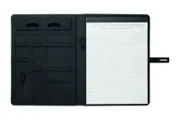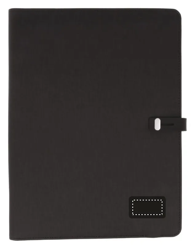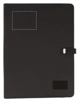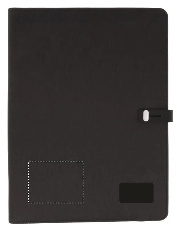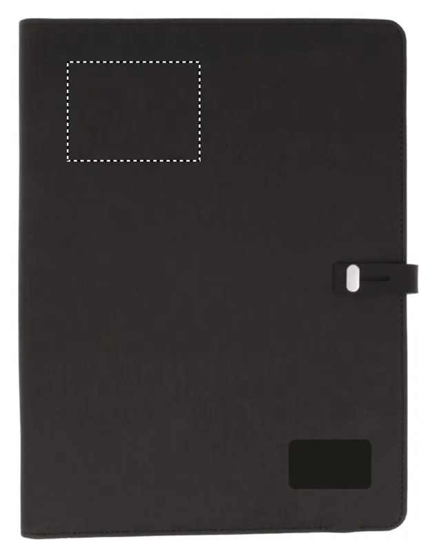 A4 konferenciamappa vászon és PU anyagból, csatos záródással. DC 5V/1A vezeték nélküli töltővel és 4000 mAh külső akkumulátorral. Mikro USB és C típusú csatlakozóval. 20 vonalas jegyzetlappal, számos belső zsebbel. Emblémázáshoz ideális kis fekete alumínium lappal.