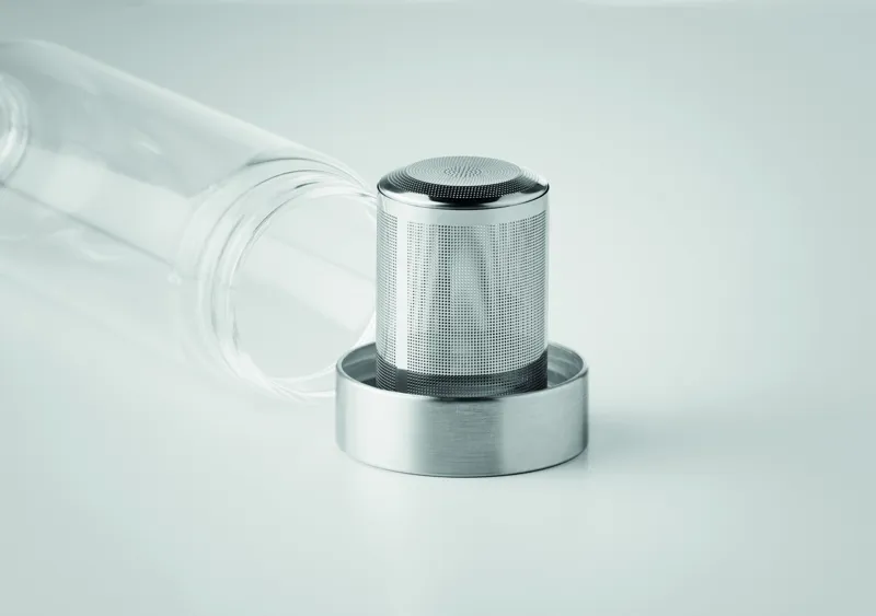 Szimplafalú palack hőálló boroszilikát üvegből, teaszűrővel és neoprén tokkal. Űrtartalom: 500 ml. Nem alkalmas szénsavas italokhoz. Szivárgásmentes. A lézergravírozás nem lehetséges a boroszilikát üvegen.