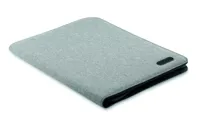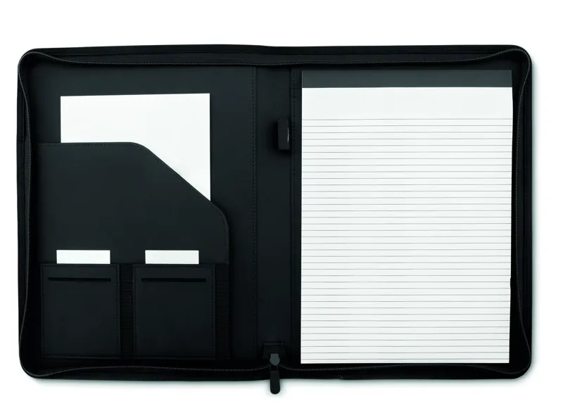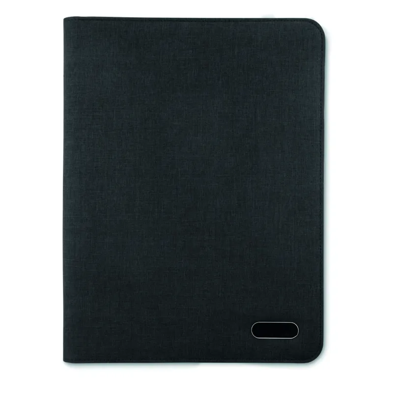 A4 konferenciamappa melírozott színű poliészterből. Cipzárral. 20 oldalas vonalas jegyzettömb. 3 rekesz. Tolltartó hurok.