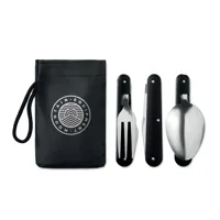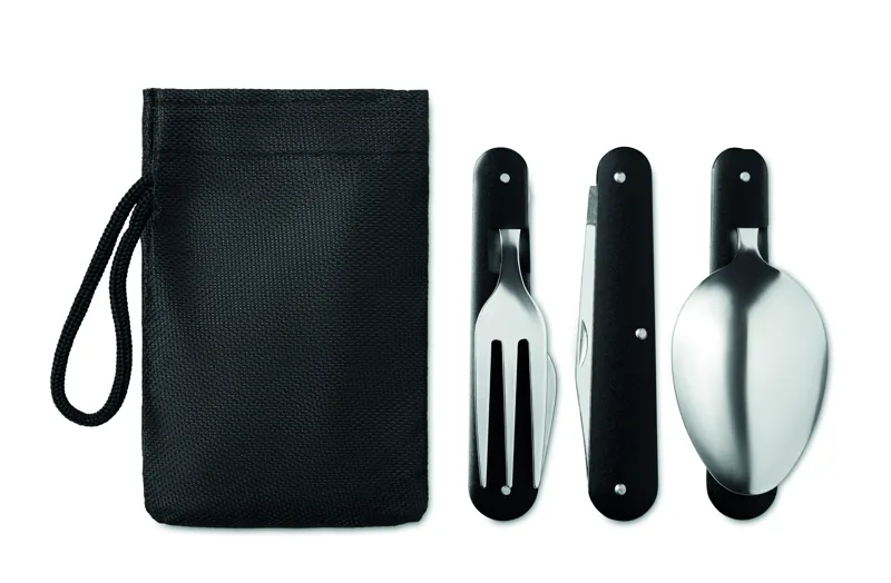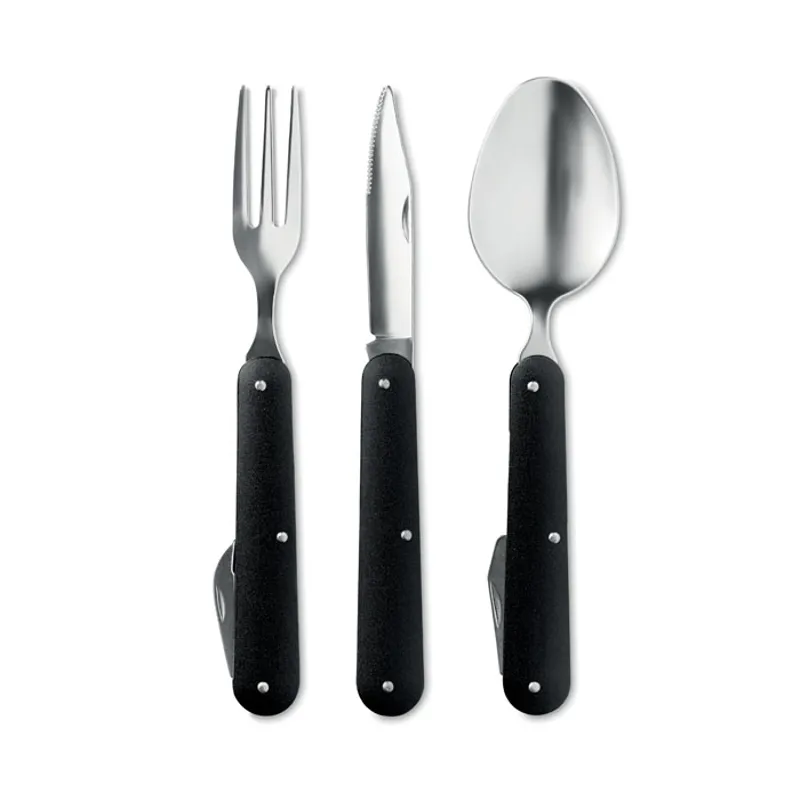 Kemping evőeszköz készlet, rozsdamentes acélból, alumínium nyéllel. Multifunkciós kanál, villa és kés fehér ajándékdobozban.