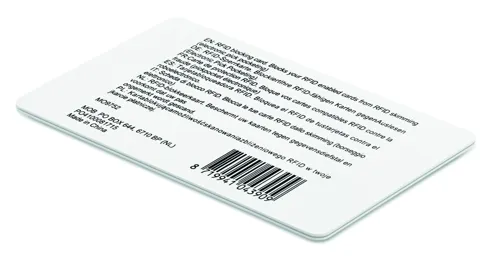 RFID blokkoló kártya. A kártyán belüli alumínium réteg blokkolja minden rádiófrekvencia átjutását. Emögött a kártya mögött elhelyezett kártyák skimmelés elleni védelmét biztosítja. (0,76 mm).