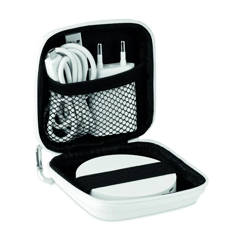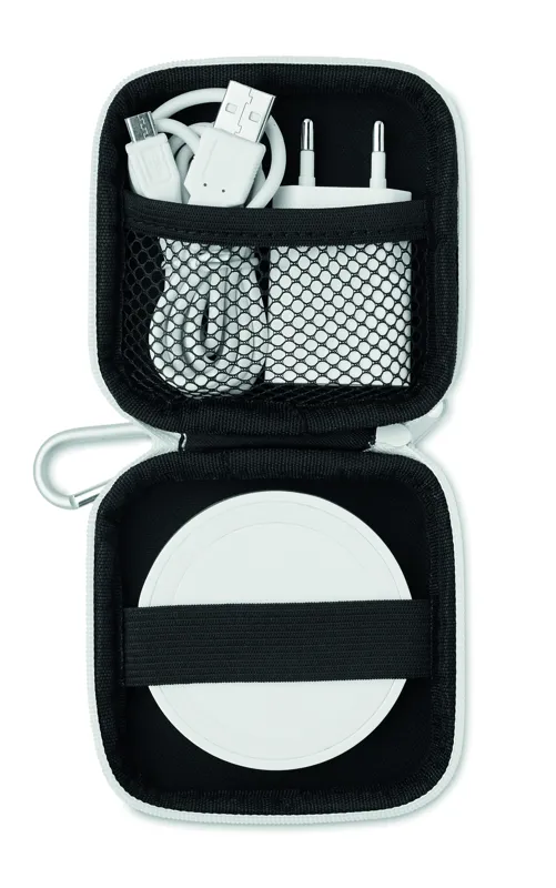 ABS műanyag vezeték nélküli töltő készlet, EVA/PU tokban. EU villásdugóval és USB A - mikro B töltőkábellel. Teljesítmény DC9V/1.66A (5W).