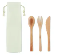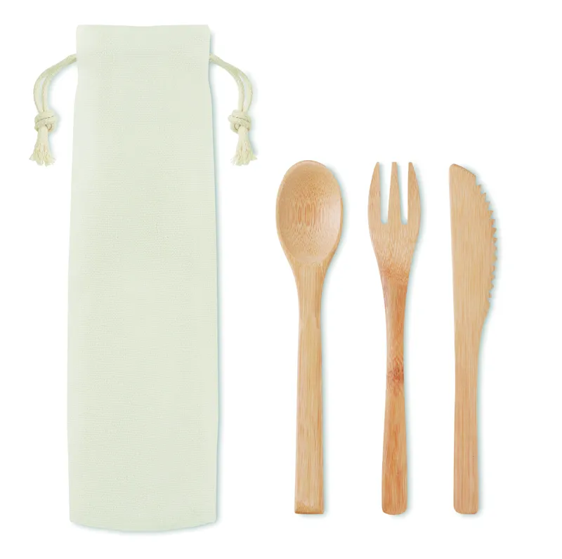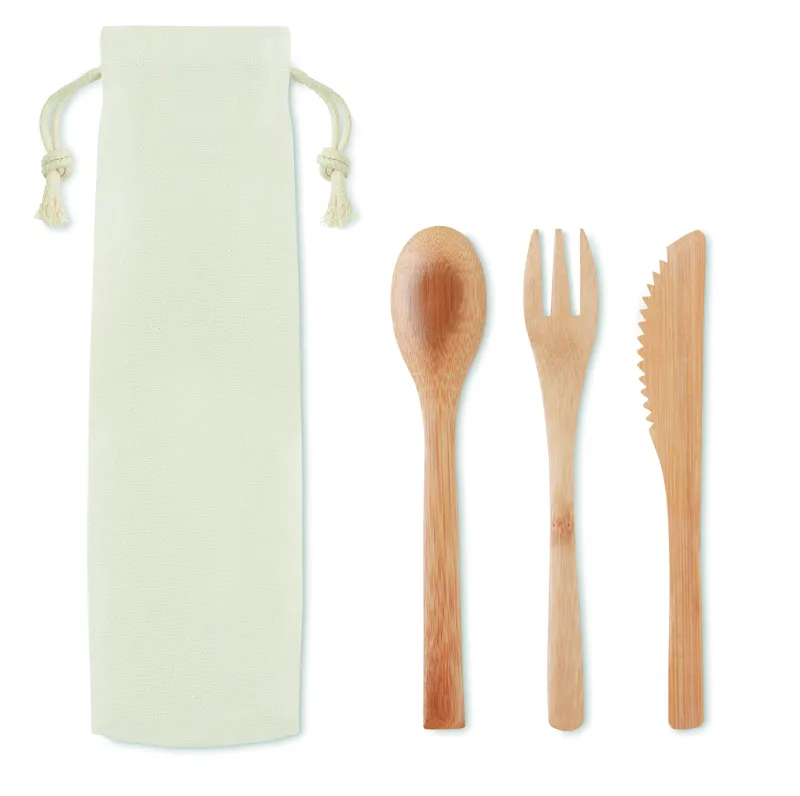 Többször használható bambusz evőeszköz készlet vászon tokban, késsel, villával és kanállal. A bambusz természetes anyag, színében, mintázatában és méretében esetenként eltérő lehet.