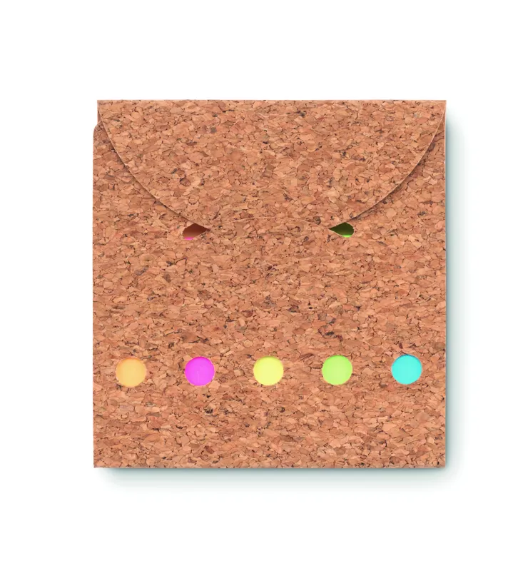 Öntapadós jegyzetelő szett boríték jellegű parafa borítóval. 125 lapos nagyméretű sárga öntapadós jegyzettömb és 25 lapos, 5 különböző színű lapjelző. A parafa 100%-ban természetes anyag. Szerkezeti jellege és felületi porozitása miatt az egyes tárgyak végső emblémázási eredménye eltéréseket mutathat.