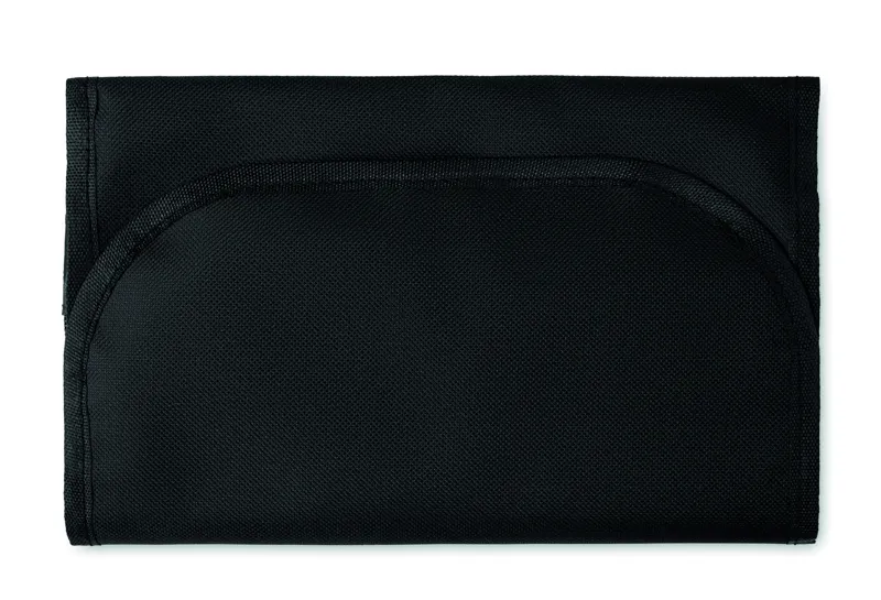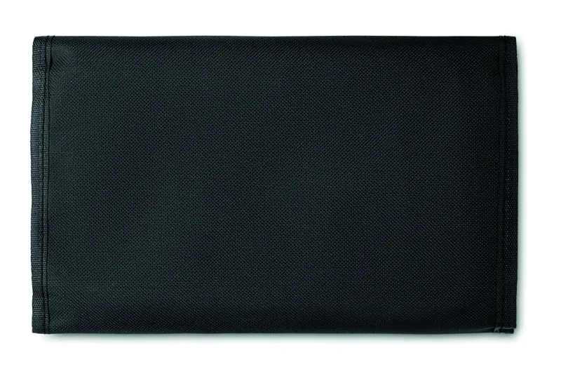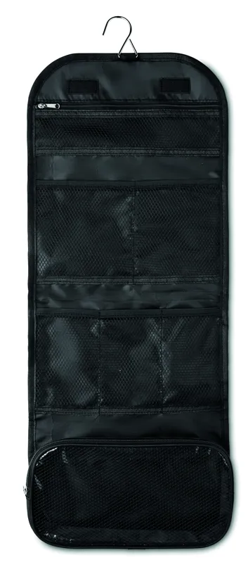 Úti kozmetikai táska 600D és 300D poliészter anyagból, hálós rekeszekkel és egy PEVA rekesszel.