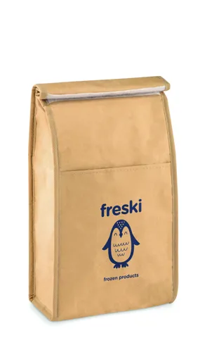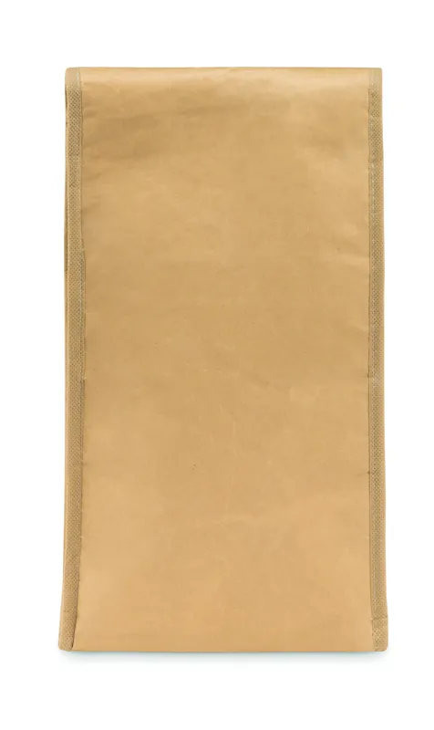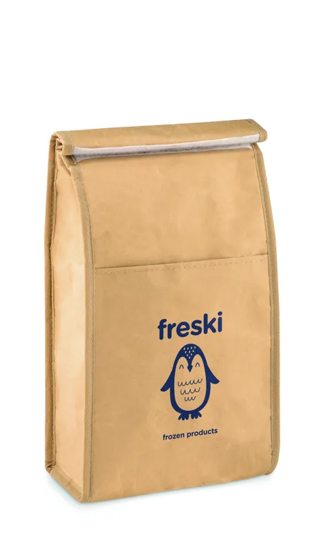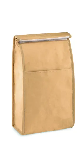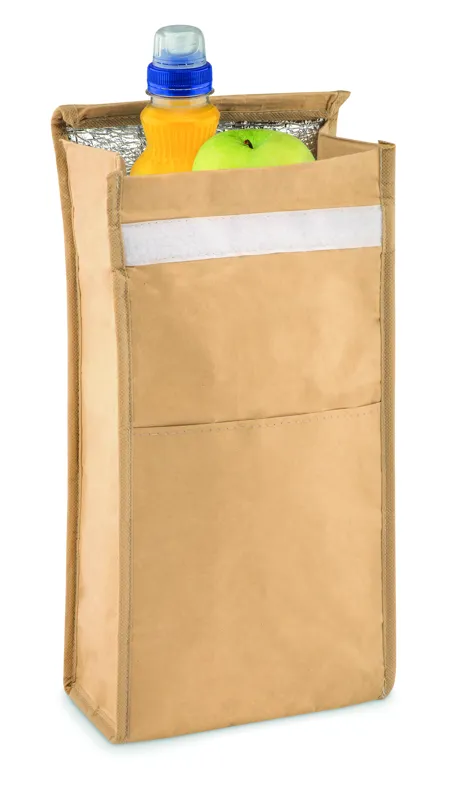 Szövött, újrahasznosított papírból készült uzsonnás tasak, első zsebbel. Szigetelő anyag: alumínium fóliával laminált hab. Űrtartalom 3 l.