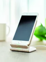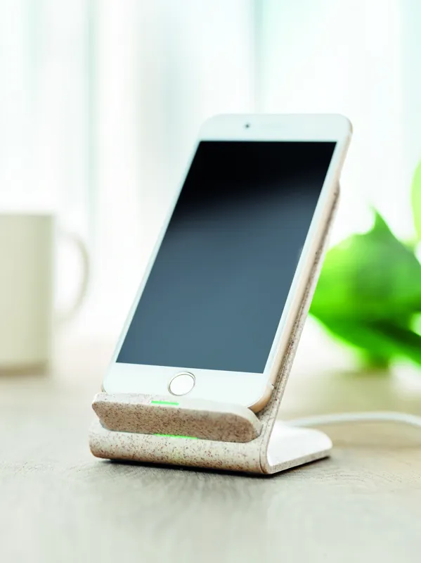 Kéttekercses vezeték nélküli töltő és telefontartó, 35% búzaszalma és 65% ABS összetevőkből. Teljesítmény: DC5V/2A (10W) (gyors töltés).