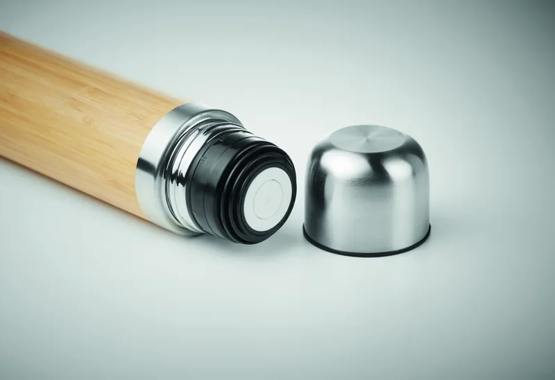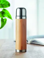 Duplafalú rozsdamentes acél termoszpalack bambusz borítással. Űrtartalom 400 ml. A bambusz természetes anyag, színében, mintázatában és méretében esetenként eltérő lehet. Szivárgásmentes.